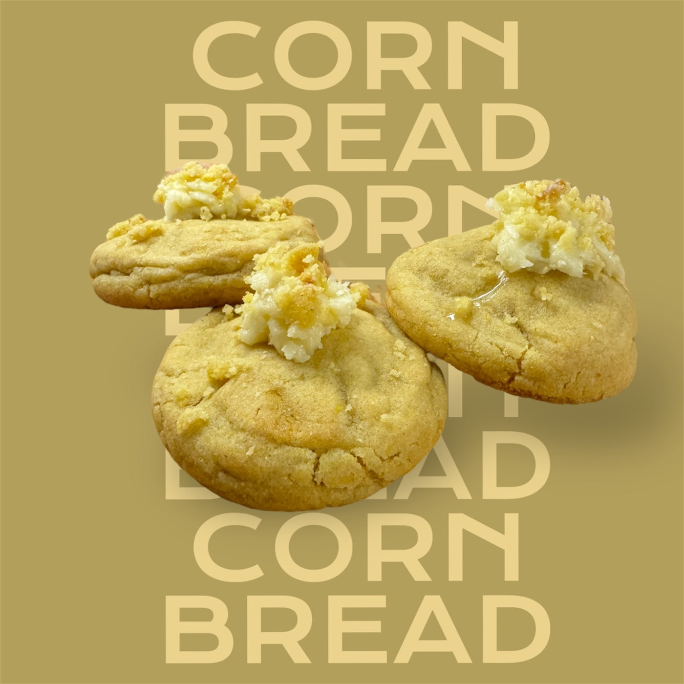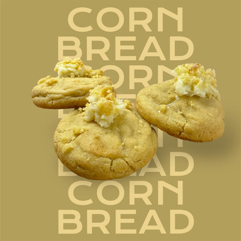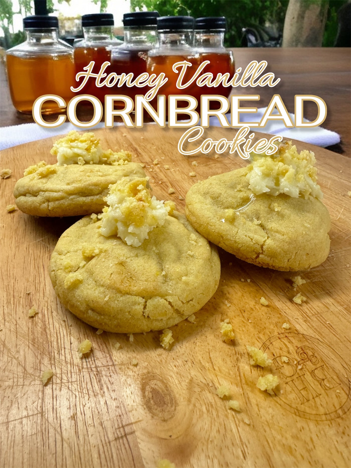 A soft, golden cornbread-inspired cookie with a hint of sweetness and buttery crunch, topped with a silky honey vanilla buttercream that melts into each bite. It’s like your favorite cornbread drizzled with honey—but in cookie form.