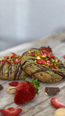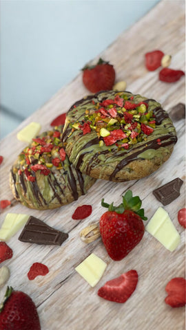 A luxurious bite of romance - rich chocolate and creamy white chocolate embrace juicy strawberry, pistachio butter, and roasted pistachios in a cookie inspired by the popular and decadent Dubai chocolate-covered strawberry. One taste, and you're swept away.